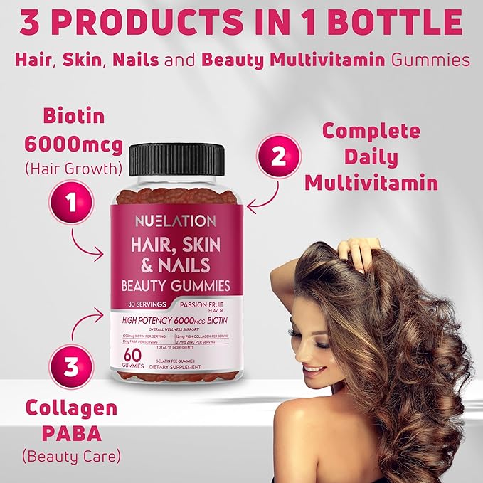 - DELICIOUS & FUN TO TAKE: Enjoy your beauty boost with a tasty passion fruit flavor that feels like a treat. No more pills or bitter hair supplements. Take two delicious hair gummies daily to support glowing skin, shiny hair, and strong nails.