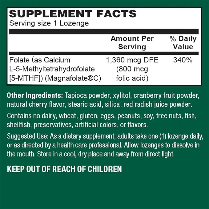 - Fast-Acting Sublingual: Delicious cherry flavor lozenge; dissolves quickly under the tongue for rapid absorption of methylfolate directly into the bloodstream; supports mental clarity, focus, and a positive outlook
