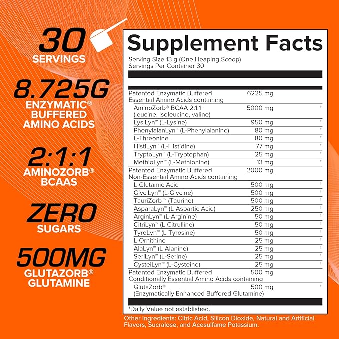 - THE FULL SPECTRUM ADVANTAGE: AminoZorb Elite 21 isn't another copycat BCAA or EAA blend. It's the complete amino acid revolution you've been waiting for. It’s packed with 8.725g of enzymatic buffered amino acids for rapid muscle recovery and sustained energy.