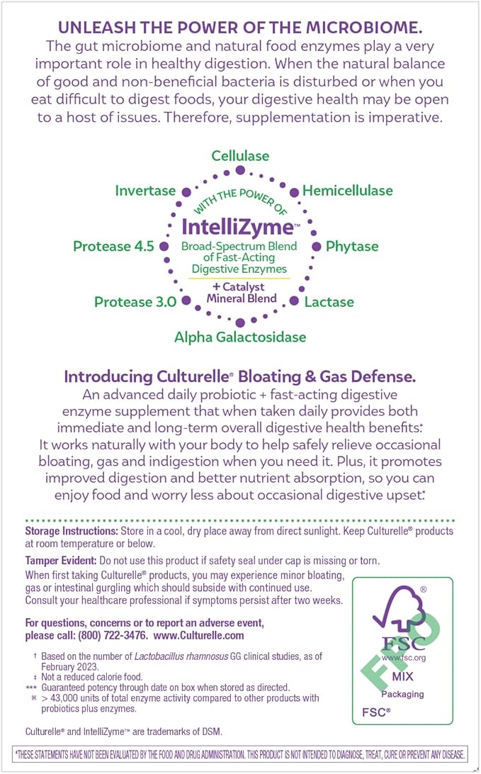 - TRIPLE-ACTION RELIEF: Culturelle Bloating & Gas Defense is a probiotic and fast-acting digestive enzyme supplement with a unique triple-action formula.* It naturally works with your body to safely reduce occasional bloating, gas and indigestion.