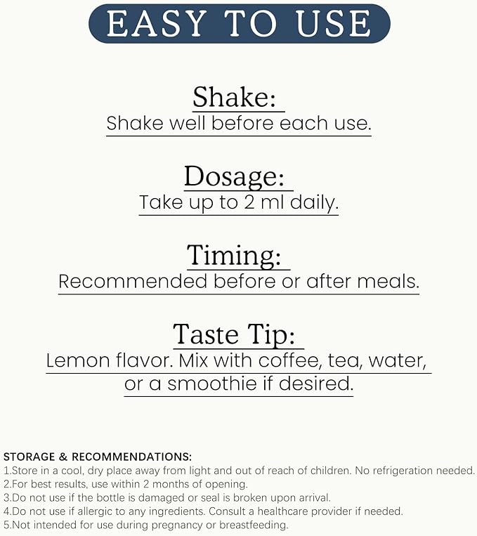 - 【Easy to Use】Shake well before use. Can be taken directly (2ml per day, preferably after meals.), or added to water, tea, coffee, or salads. The mild lemon flavor makes it easy to consume, and liquid supplements offer convenient dosage adjustment compared to solid forms.