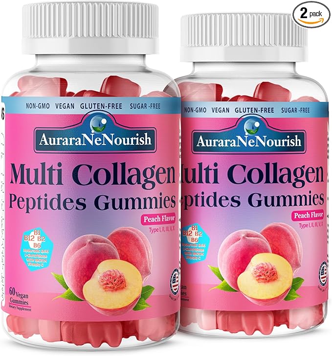2 Pack Multi Collagen Peptides Gummies, Sugar Free Hydrolyzed 5000mg Protein丨Type I,II,III,V,X with Biotin Hyaluronic Acid Vitamin C A D B6 B12 L-Glutathione for Skin Hair Nail & Joint -Peach
