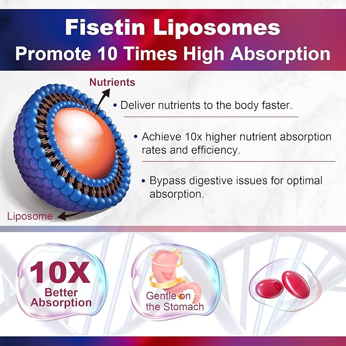 - [Why Choose the Liposomal]: Our Liposomal Fisetin softgel supplement offers 10x superior absorption and bioavailability. The liposomal delivery system encases fisetin in a protective lipid layer, allowing it to bypass digestive barriers and be more effectively absorbed into the bl--dstream. This enhances its potency, enabling you to fully experience the age-defend benefits. Our formula maximizes efficacy, providing a convenient and powerful way to support healthy aging, and brain longevity.