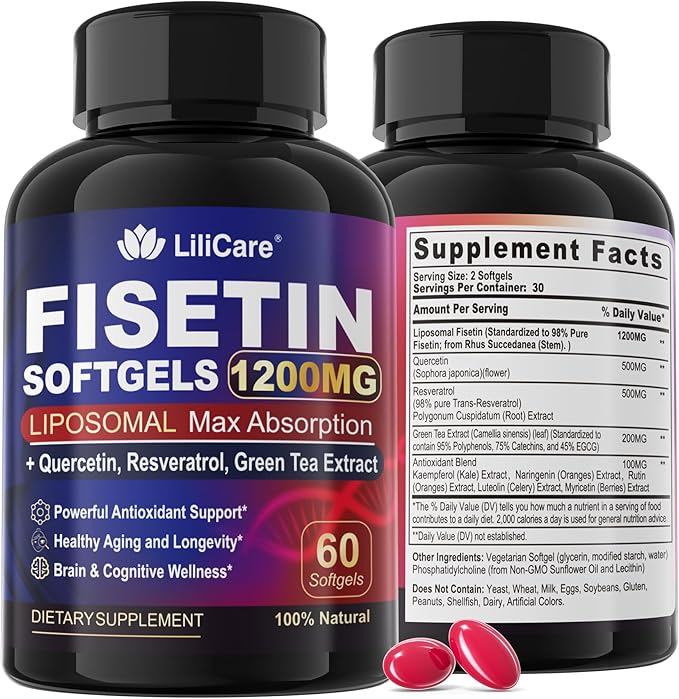 - [Powerful Antioxidant & Brain Health Support]: Our liposomal fisetin supplement is crafted for potent brain health and antioxidant support. Enhanced with quercetin and resveratrol, it reduces oxidation and supports cognitive function. Green tea extract, rich in EGCG, further boosts brain and metabolic health. This unique antioxidant blend, including Kaempferol and Myricetin, offers comprehensive support, promoting healthy aging and overall cellular vitality.