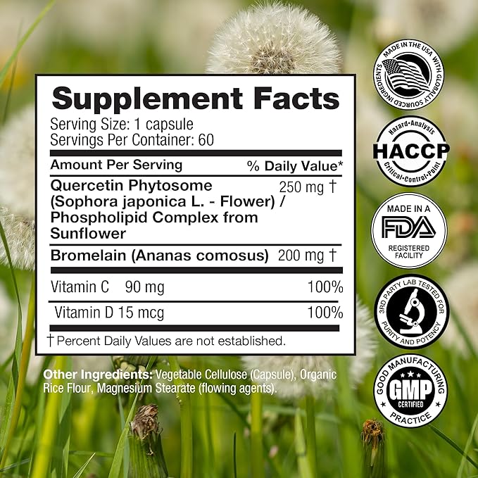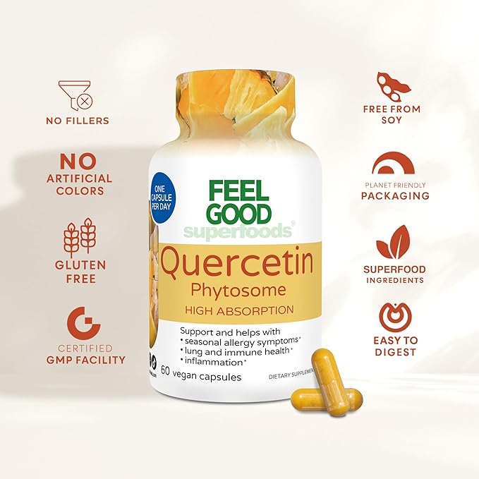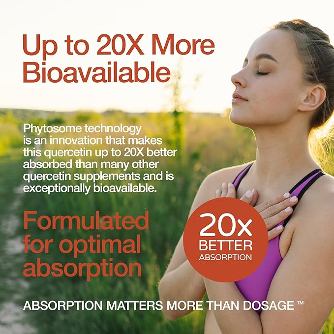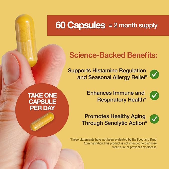 - SUPPORTS SEASONAL ALLERGIES & HEALTHY AGING: Clinically studied quercetin phytosome helps regulate histamine, reduce inflammation, and support respiratory comfort — while acting as a natural senolytic to promote healthy aging at the cellular level.*