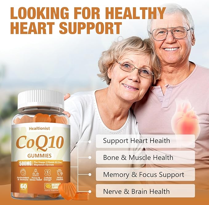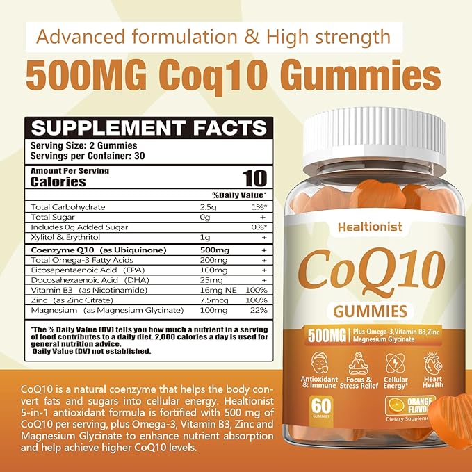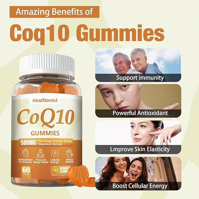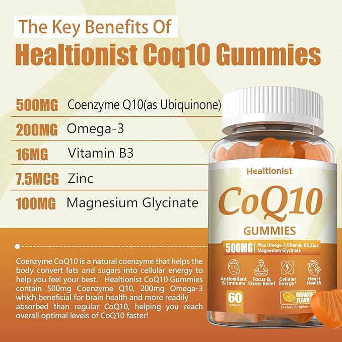 - High Content 500MG Coq10 Gummies: Unlike the regular coq10 gummies or coq10 supplement on the market, Healtionist 500mg coq10 gummies and more effectively replenished your coq10 levels than regular coq10,a natural coenzyme that helps the body convert fat and sugar into cellular energy. We Healtionist contain 500 mg of coq10 per serving,plus Omega-3,vitamin B3 and zinc to enhance nutrient absorption and help achieve higher coq10 levels.
