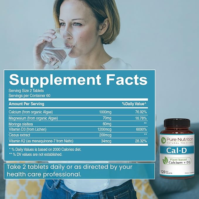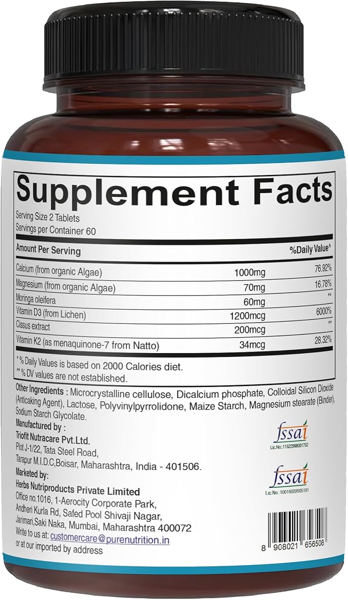 - Pure Nutrition Calcium Supplment includes 500mg of Algae Calcium (elemental), 35mg of Plant Based Magnesium, 24000 IU of Vegan D3 from lichen and 17 mcg of Vitamin K2 MK7 from Natto, 30 mg of Moringa Oleifera and 100mg Cissus Extract.