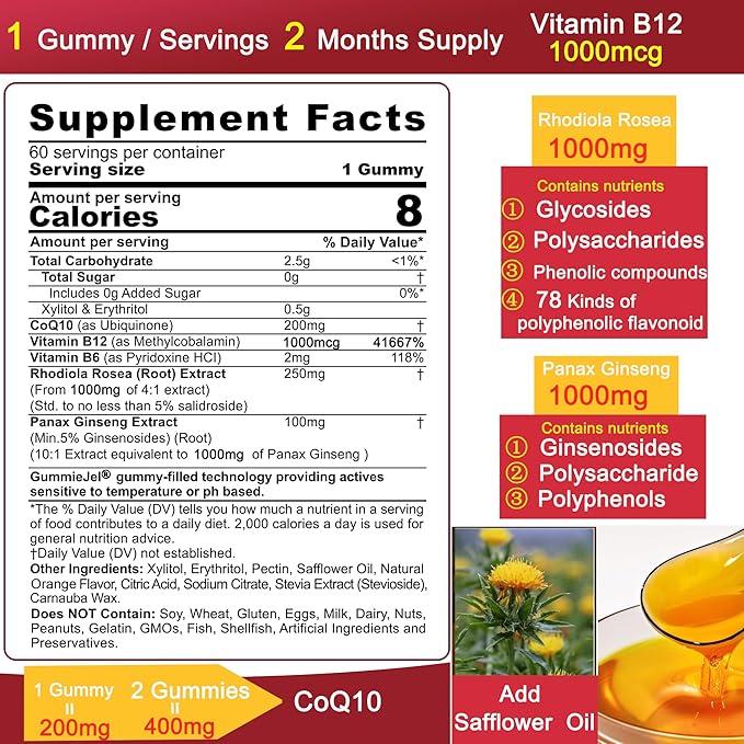 NEVISS Sugar Free CoQ10 Filled Gummies with Vitamin B12 1000mcg, Rhodiola Rosea and Panax Ginseng Extract, Vitamin B6, Coenzyme Q10 Supplement, 2 Pack