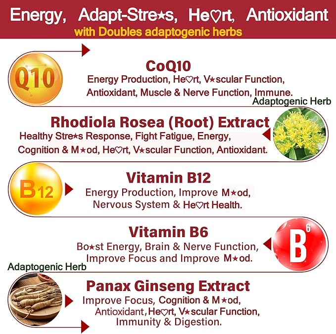 - CoQ10 wth Ginseng, Rhodiola Rosea Extract, Vitamin B6, B12.