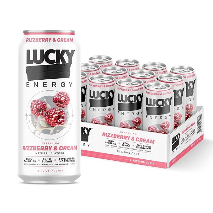 Lucky Energy Sugar Free Energy Drinks 16 Fl Oz Cans (12-Pack) Rizzberry and Cream with Maca, Ginseng, Taurine, Beta-Alanine, 200mg Caffeine