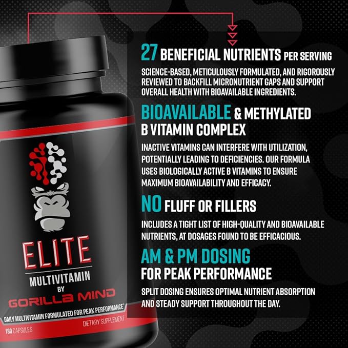 Gorilla Mind Elite Multi-Vitamin (180 Capsules) – Daily Multivitamin Formulated for Peak Performance | 27 Nutrients to Backfill Micronutrient Shortcomings