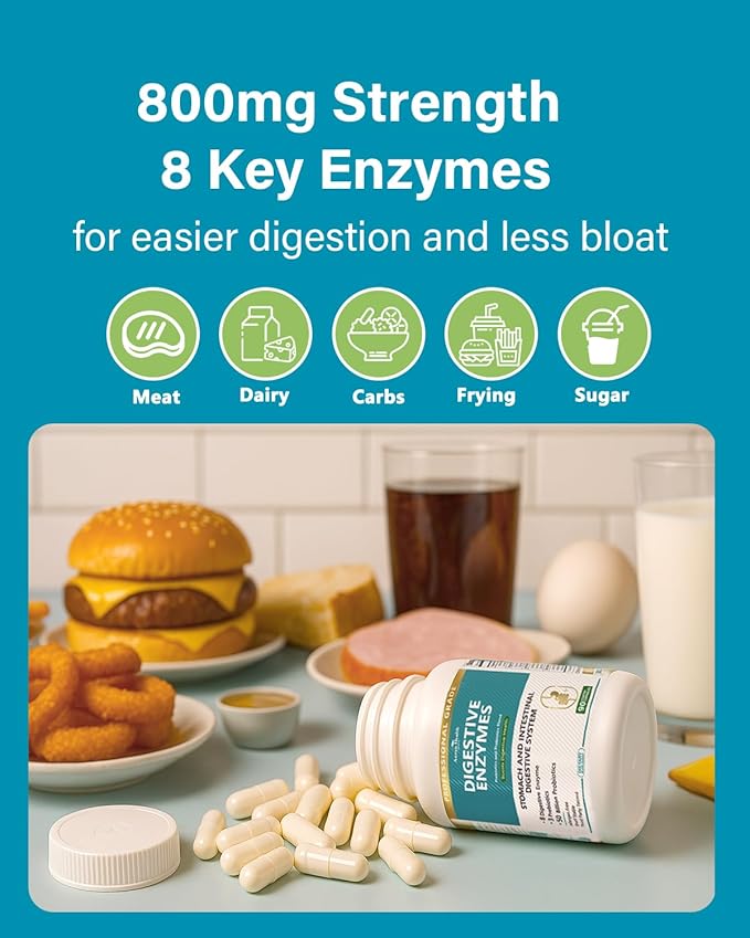 - 800mg Digestive Enzyme Blend -- 8 key enzymes—including amylase, protease & lipase—help break down carbs (rice, bread, pasta), proteins (meat, eggs, shakes), fats (fried foods, creamy dishes), plus dairy & beans. High-strength formula supports faster, more complete digestion.