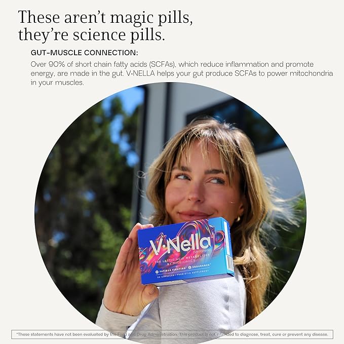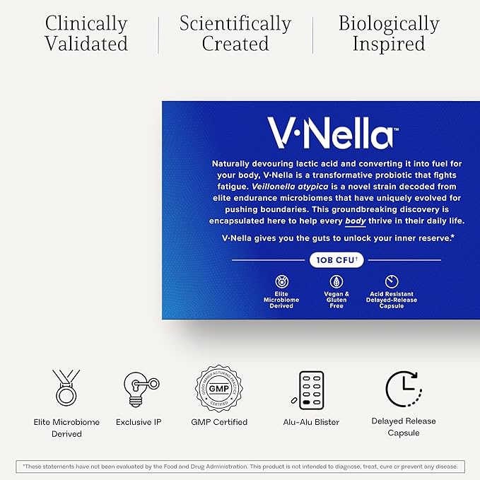 - NATURAL ENERGY BOOST: VNella helps fight fatigue and increase energy and endurance by leveraging Veillonella atypica, a novel beneficial microbe decoded from the microbiomes of the top 0.01% healthiest and fittest individuals in the world, specifically ultra marathon runners. VNella naturally eats lactic acid, a by-product associated with fatigue, and converts it into beneficial short-chain fatty acids (SCFAs) that fuel your body.