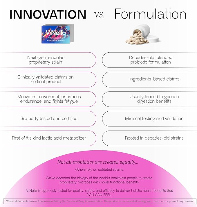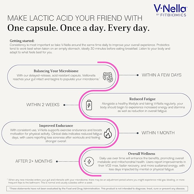 - FATIGUE FIGHTER & ENDURANCE SUPPLEMENT: Imagine a probiotic that helps you exercise more while reducing fatigue. VNella is the world’s first lactic acid metabolizing microbiome probiotic that can help combat fatigue and tiredness, enhance endurance, and motivate movement.