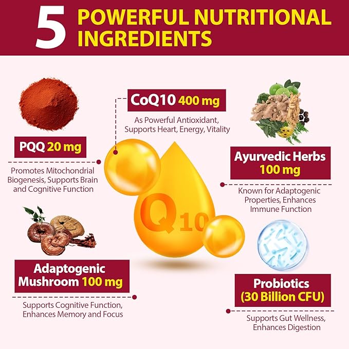 - 5-IN-1 SCIENCE-BASED FORMULA: Our co q 10 supplement provides 400 mg CoQ10 and 20 mg PQQ per serving, compared to coq10 300 mg, coq10 200 mg, or coq10 100 mg gummies, Ciaceae coq10 gummies 400 mg has maximum strength CoQ10 & PQQ, enhanced with Ayurvedic Herb Blend, Adaptogenic Mushroom Blend, Probiotics, the highest potency available for heart function, energy, and offers superior antioxidant protection