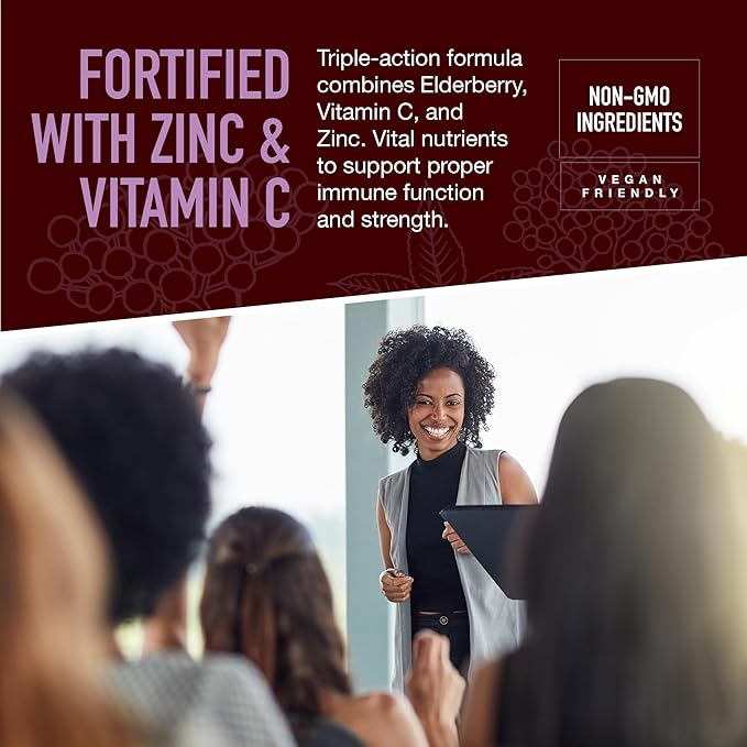 - SAMBUCUS ELDERBERRY + VITAMIN C + ZINC – A triple-action immune support formula with Black Elderberry, Vitamin C, and Zinc. Elderberry provides antioxidants, Vitamin C supports immune function, and Zinc promotes immune strength.*