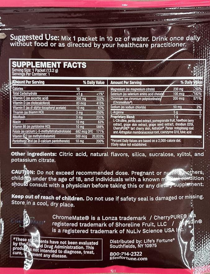 - Life's Fortune L-Arginine with Great quality and flavor. More active ingredients for easier absorption including Vitamin C, Vitamin E, Vitamin D, Vitamins B6 & B12, Folate, Calcium, Niacin and Magnesium.