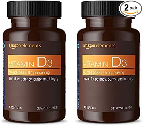 Amazon Elements Vitamin D3, 2000 IU, 180 Softgels, 6 Month Supply (Packaging May Vary), Supports Strong Bones and Immune Health (Pack of 2)