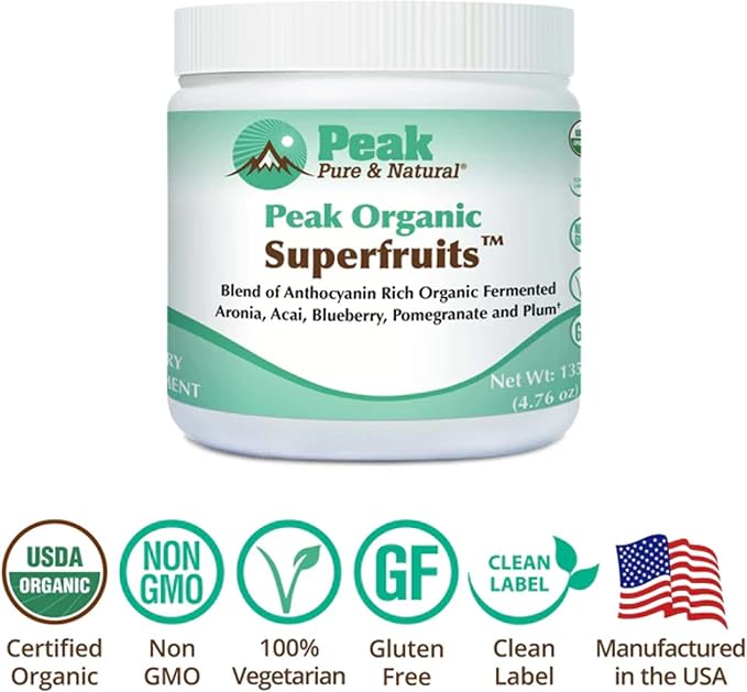 - CLEAN LABEL, PREMIUM QUALITY: Peak Organic Superfruits is a vegetarian, non-GMO, gluten-free supplement, manufactured in the USA. Each ingredient is carefully sourced for purity and efficacy, ensuring optimal overall health without compromise.