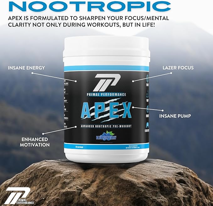 - Energy & Focus Support: Primal Performance Apex Energy & Focus Nootropics Drink Mix offers a balanced combination of 150 mg of caffeine, L-Citrulline, and AlphaGPC, designed to help maintain energy levels and mental focus during workouts and outdoor activities.