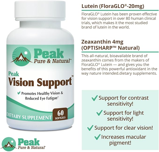- PEAK VISION SUPPLEMENT: Peak Vision Support is a dual nutrient (zeaxanthin and lutein) formula designed to help protect your eyes from blue light damage and support clear vision, macular pigment, contrast sensitivity, light sensitivity, night vision, and overall eye health.