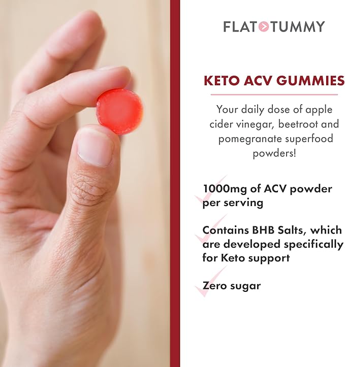 - SO TASTY, AND SO CONVENIENT: Two Flat Tummy Keto ACV Gummies per day provide 1,000 mg apple cider vinegar powder, as well as 125mg of BHB Salts and 80 mcg each of pomegranate and beetroot superfood powders. All in our delicious tasting gummies!