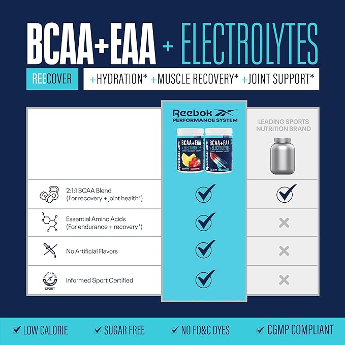 - Scientifically Formulated for Faster Recovery: With Reebok’s performance-driven legacy, we’ve spent decades understanding what athletes need. Enter [REE]COVER. Speed up muscle recovery and support your joints with a powerhouse blend of amino acids that helps reduce soreness and fatigue. With [REE]COVER, you’ll be ready to attack your next workout harder and faster. Plus, our formula is clean and made to the highest standards, Informed Sport Certified, with zero sugar, and no artificial dyes.