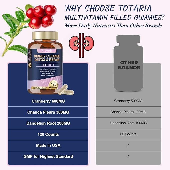 - Premium Quality: Totaria Kidney Liver Cleanse Capsules are carefully crafted using only the finest ingredients to ensure optimal results. All Totaria products are thoroughly inspected and adhere to strict quality assurance procedures to ensure safety and effectiveness. Try our Kidney Cleansing Capsules, believe you will be healthier!