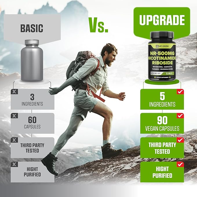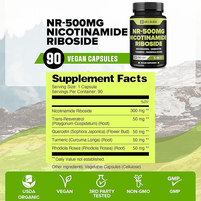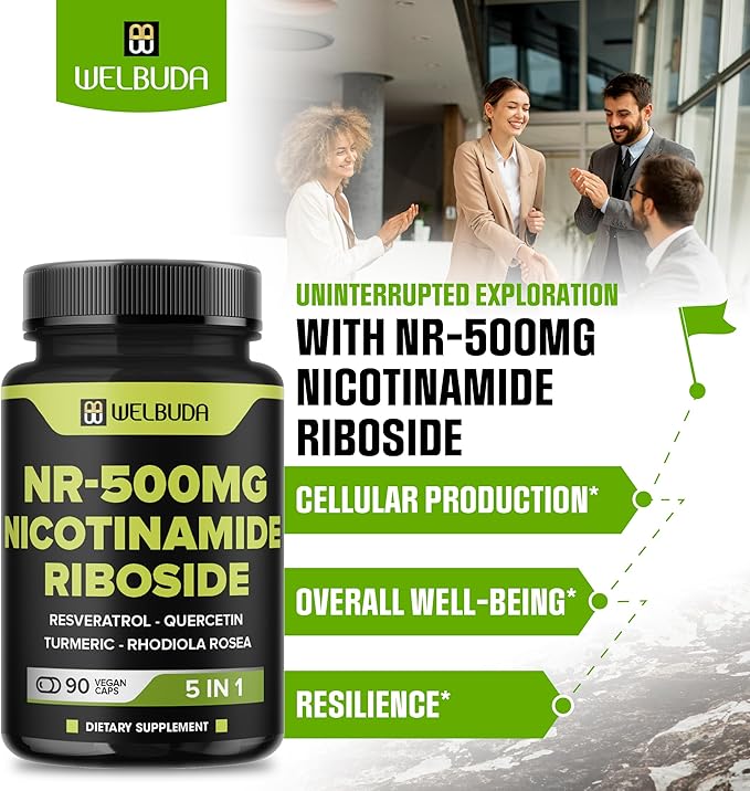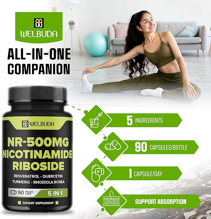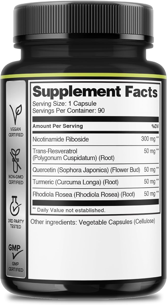 5in1+ Nicotinamide Riboside Supplement with Resveratrol, Quercetin, Turmeric, Rhodiola Rosea - 90 Count for 90 Days
