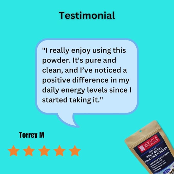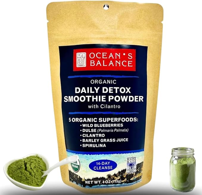 - Tasty, Healthy, Seaweed Snacks: Indulge in our Detox Smoothie Powder mix with five organic superfoods: Cilantro, Atlantic dulse flakes, organic spirulina powder, barley grass juice powder, and blueberry powder. Boost your digestion, and feel more energetic with Ocean’s Balance Detox Drink!