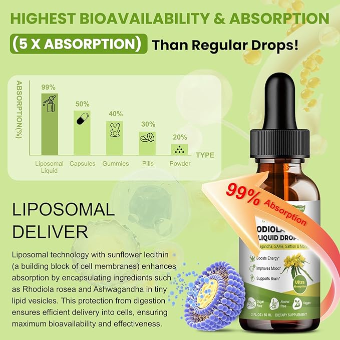 - Highest Absorption & Efficiency: Totaria Rhodiola rosea supplement tincture is standardized to 3% Rosavins and 1% Salidrosides, ensuring consistent potency and effectiveness. Combined with advanced liposomal delivery technology, it offers up to 99% absorption and enhanced stability against stomach acid degradation. Our alcohol-free, cold-extraction method preserves the delicate actives for maximum efficacy.