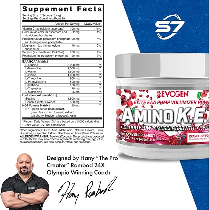 - DESIGNED BY THE PRO CREATOR – Developed by Hany Rambod, 25X Olympia-winning coach, Evogen Amino K.E.M. is a science-backed amino acid powder built to maximize hydration, muscle growth, and blood flow so you can train like a champion. Pair with Evogen pre workout supplements for even better results.