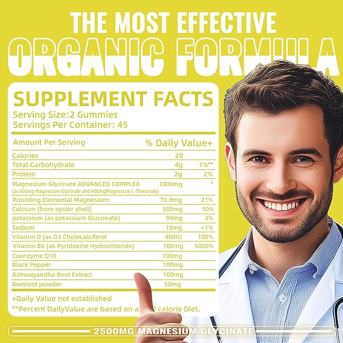 - Powerful House - Our Magnesium Gummies Contain Magnesium Glycinate 2500mg, , Vitamins D, B6, Calcium, Potassium, etc. Added Vitamin B6 help magnesium work better, Coenzyme Q10 and potassium help support the mind system and improve Memory and inattention, Vitamin D promotes the absorption of calcium