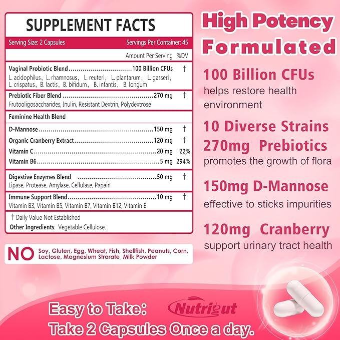 - High Potency Probiotic for Women - Nutrigut women's probiotics with 10 strains, 100 Billion CFUS probiotics to support digestive health. Each bottle provides up to 45-day supply. Target probiotics work on your target area for your digestive issues.