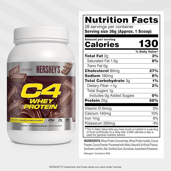 Cellucor C4 Whey Protein Powder, Hershey's Chocolate - 25g Protein, 0g Added Sugar, 130 Calories Per Serving, Supports Muscle Recovery, 28 Servings, Premium Whey for Post-Workout