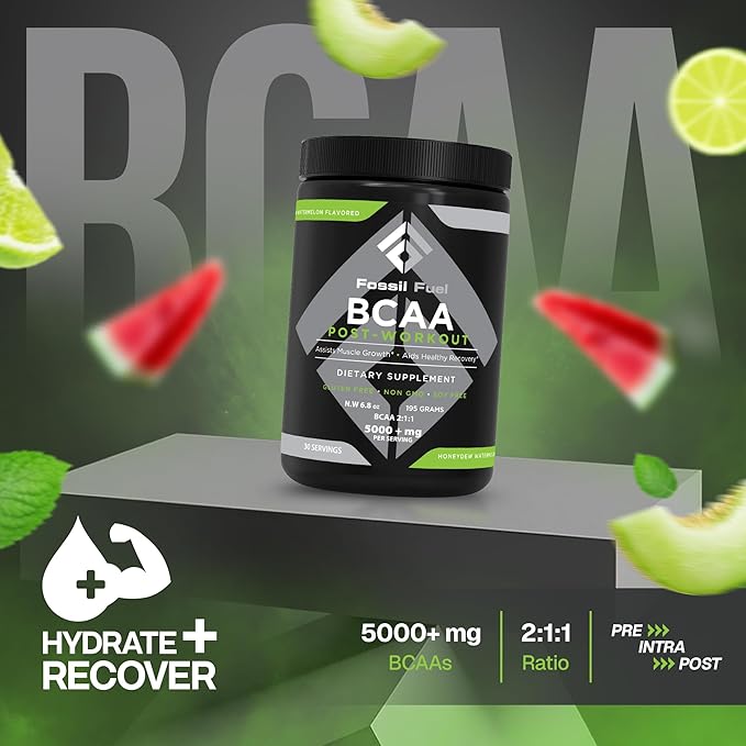 Fossil Fuel BCAA Sugar-Free Post-Workout Powder with BCAA’s, Glutamine, Vitamin B6 After Workout, Amino Acids for Muscle Recovery, Endurance and Hydration, Honeydew Watermelon (30 Servings)