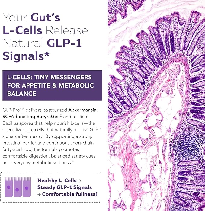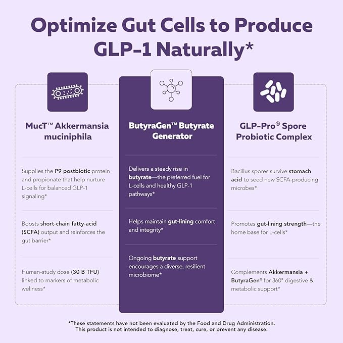 - Support Natural GLP-1 Pathways, Starting in the Gut* Pasteurized MucT Akkermansia, Short Chain Fatty Acid generating ButyraGen and resilient Bacillus spores work together to nourish L-cells—the gut messengers behind everyday GLP-1 signals for balanced appetite & metabolic wellness.*