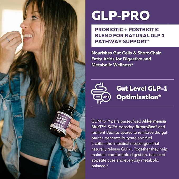- PROBIOTIC + POSTBIOTIC COMPLEX: GLP-Pro brings together clinically studied strains and postbiotic ingredients—like MucT Akkermansia Muciniphila, ButyraGen butyrate generator, and spore-forming probiotics—to help maintain a balanced gut environment and healthy metabolic processes.* Each component is used at research-backed levels, ensuring targeted support for optimal metabolic wellness.*