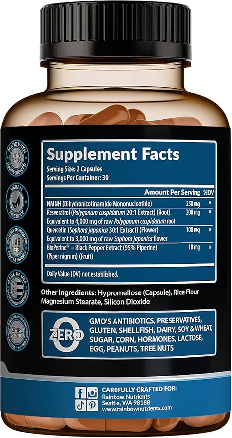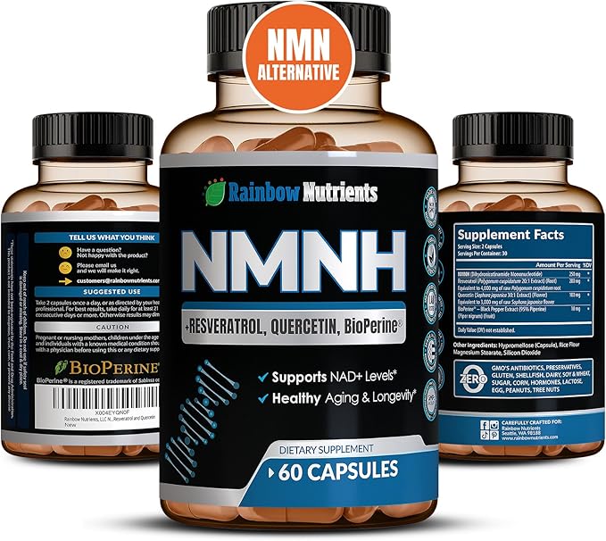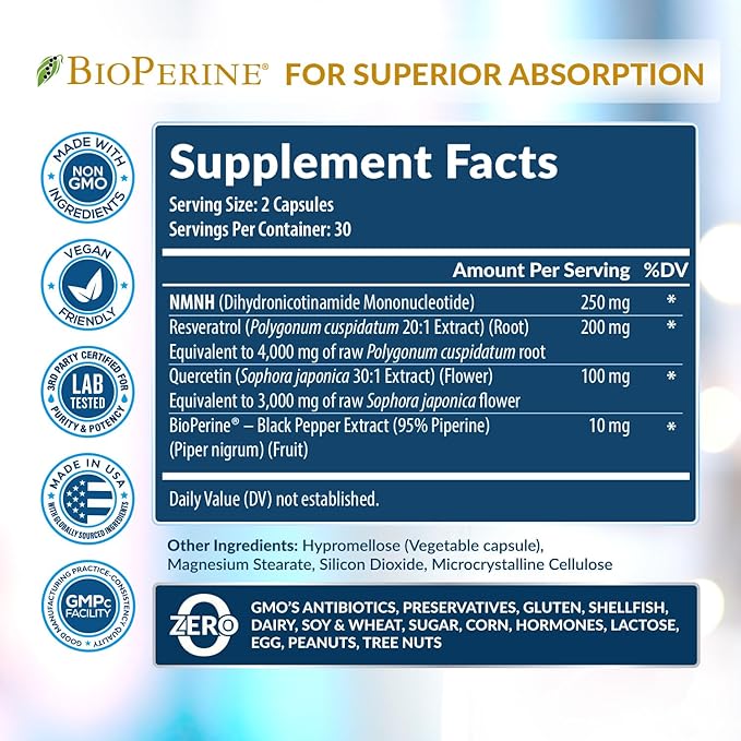 - ENHANCED ABSORPTION WITH BioPerine: Includes patented BioPerine to help increase absorption and bioavailability of NMNH, Resveratrol & Quercetin. Get the most out of every capsule & Improved energy, skin health, and performance.