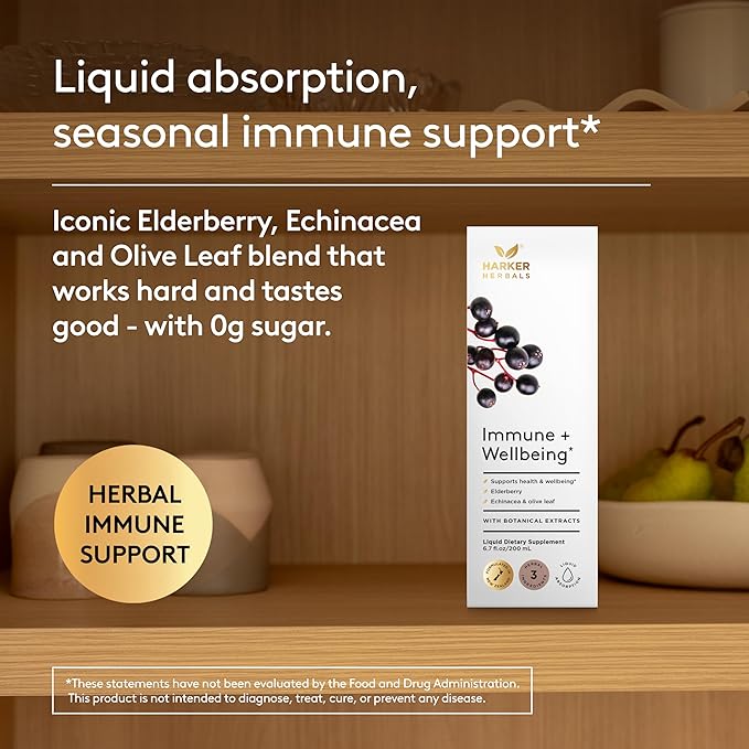 Immune + Wellbeing, Herbal Immune Support Syrup, with Elderberry, Echinacea & Olive Leaf, Liquid Absorption, Great Tasting Wild Berry Flavor, Alcohol-Free, Plant-Based, 6.7 fl oz