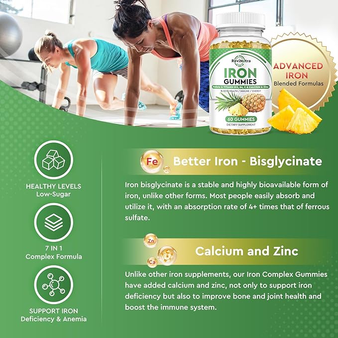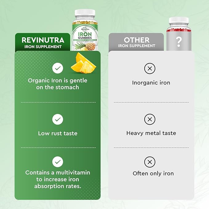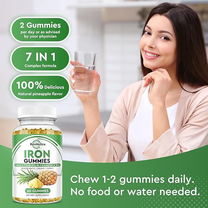 - PREMIUM IRON FORMULA: ReviNutra Iron supplements gummies contain high quality iron and Vitamin C that works with the body to increase iron absorption rates. We also formula Calcium & Zinc to our iron chewable gummy, which helps strengthen bones and teeth and boosts the immune system, and add Folate, vitamins B6, B12 to help your body increase energy and decrease fatigue without nausea or constipation