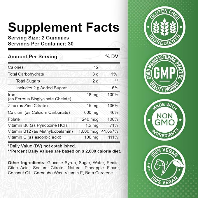 Iron Gummies with Zinc, Calcium, Vitamin C, B6 & B12 | Iron Supplement for Women, Men & Kids | Supports Anemia & Deficiency, Blood Builder & Cell Formation | Chewable Pineapple Flavor | 60 Gummies