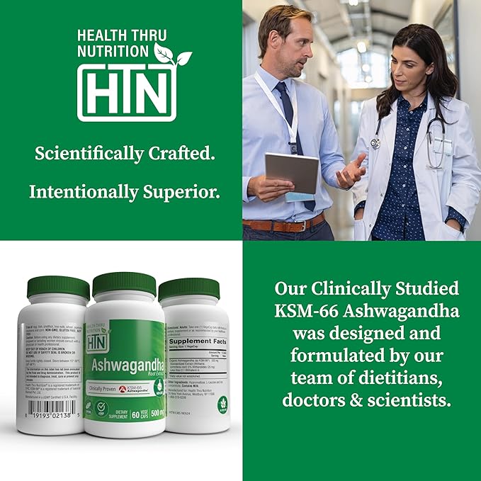 Health Thru Nutrition Ashwagandha 500mg KSM66® 60 Capsules | Stress, Mood, Focus, & Energy | Clinically Proven and Organic Root-Only Whitania Somnifera Extract | Non-GMO, Gluten & Soy Free