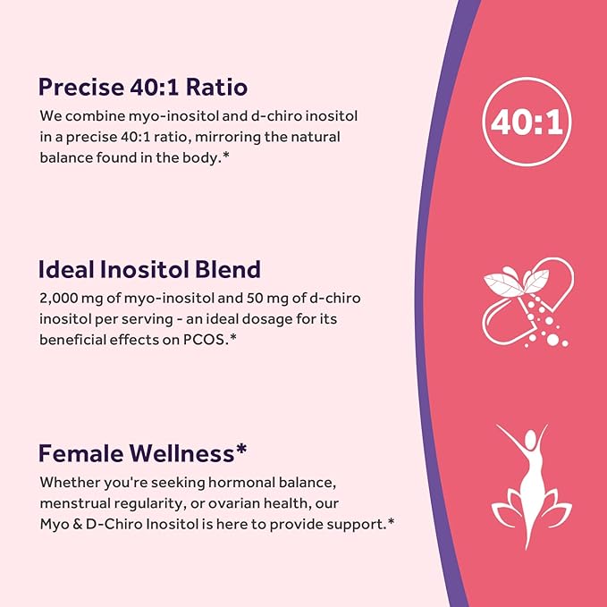 - Ideal 40:1 Blend of Myo-Inositol & D-Chiro Inositol: Designed specifically for women's reproductive health, our inositol supplement combines myo-inositol and d-chiro inositol in a precise 40:1 ratio, mirroring the natural balance found in the body.* Each serving of 4 capsules delivers 2,000 mg of myo-inositol and 50 mg of d-chiro inositol - an ideal dosage that is beneficial for conditions like PCOS.*