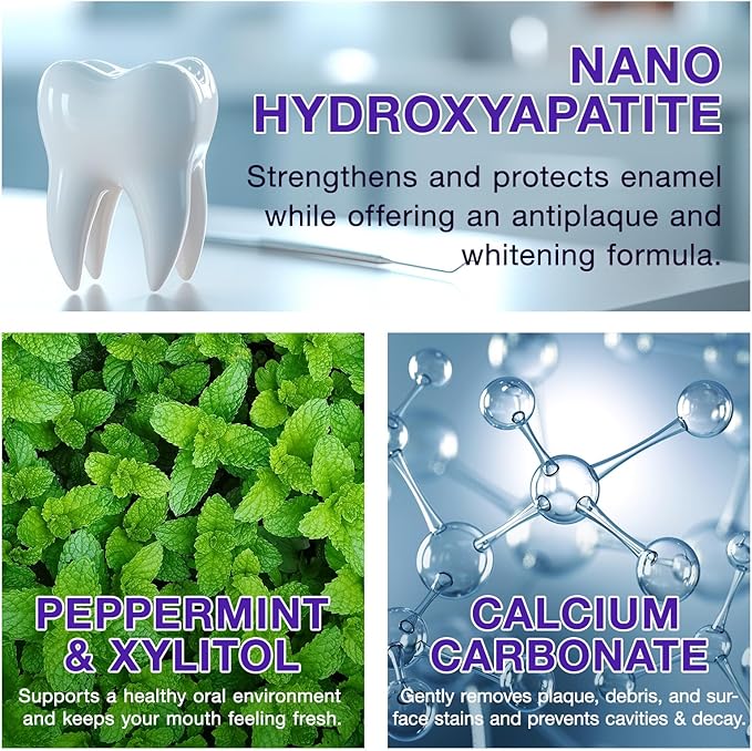 - 【NANO-Hydroxyapatite】Our toothpaste tablets include a revolutionary ingredient called Nano-Hydroxyapatite, which is mineral form of calcium found in bone, dentin, and dental enamel. It is a fluoride alternative that provides natural remineralization, protection against sensitivity, prevention of cavities, teeth decay and enhanced whitening for a beautiful and brigtht smile.