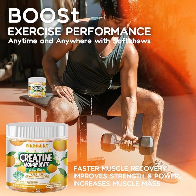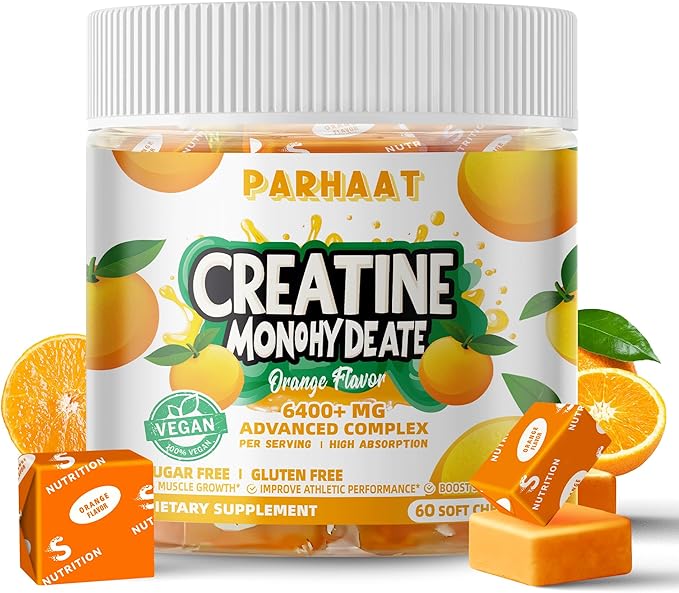 Creatine Monohydrate Chews Complex 6400mg for Men & Women -Advanced Formula W/L-Taurine + Vitamin B12, Sugar Free Chewable Supplement,60 Orange Softchews