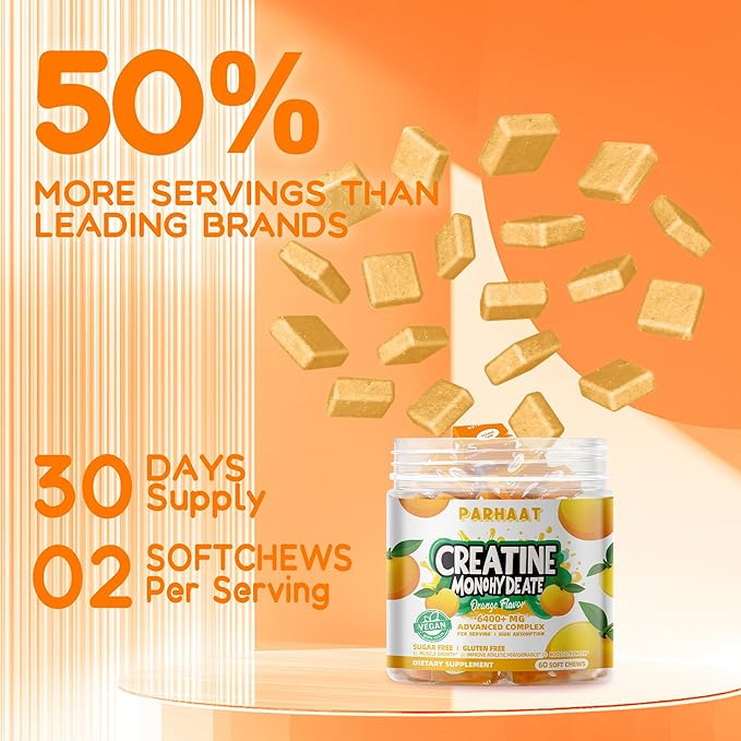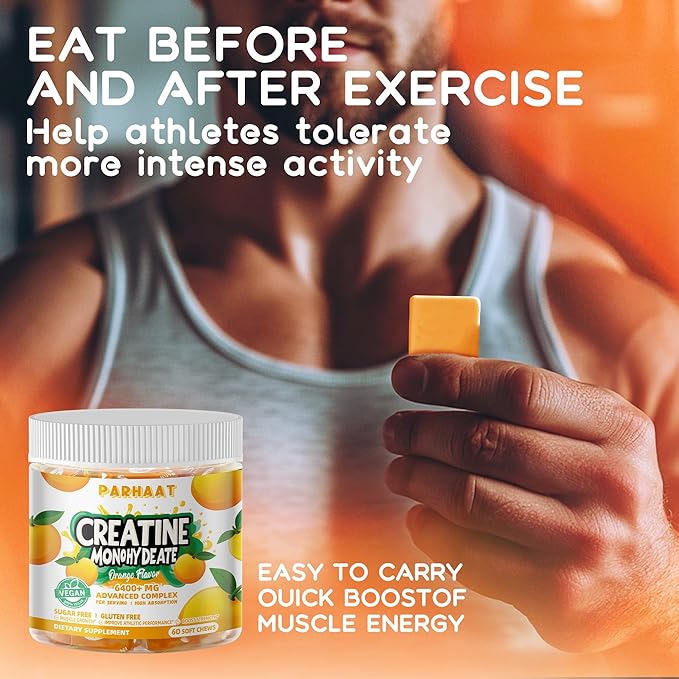 - [Vegan, Gelatin Free, Sugar free]: Each bottle contains 60 count vegan,sugar free creatine monohydrate Chews. Super delicious. Individually wrapped for on the go convenience. features a gummie like candy texture. Each chewy bite is also gluten free.