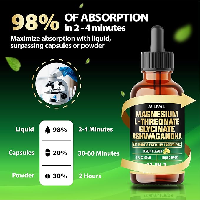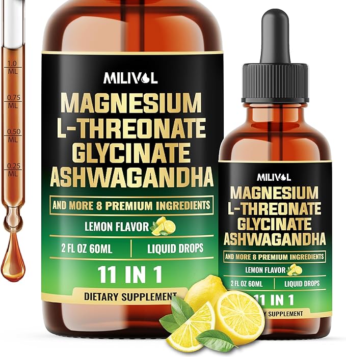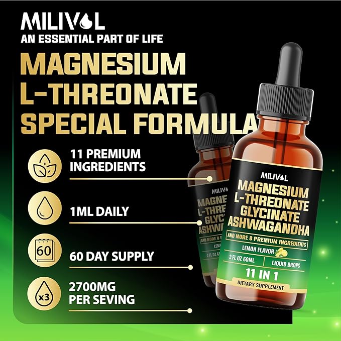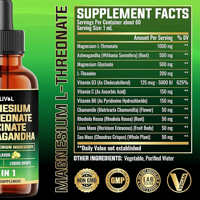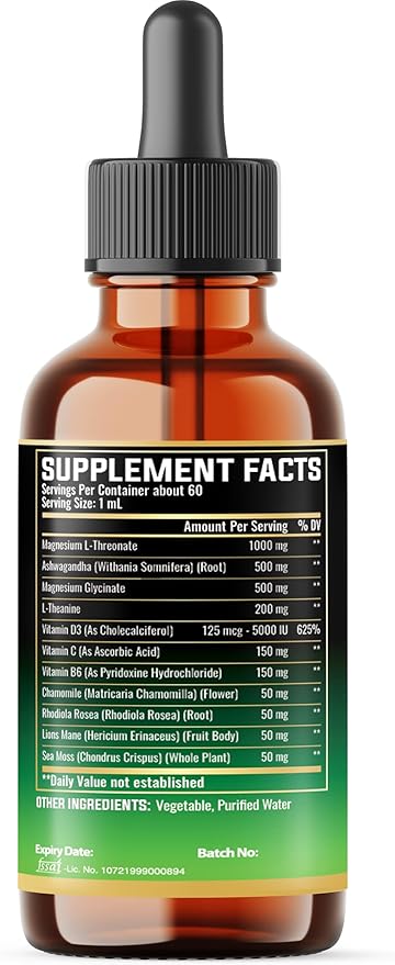 - ✔️Highly Concentrated: Magnesium L-threonate Liquid Drops include Magnesium L Threonate, Magnesium Glycinate, Ashwagandha Root, Vitamin D3, Vitamin C, Vitamin B6, L-Theanine, Chamomile Flower, Rhodiola Rosea, Lions Mane, and Irish Sea Moss.