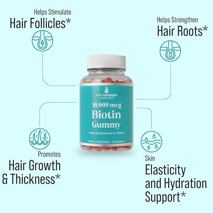 - With Biotin 10000mcg gummies, these gelatin free, vegan Biotin chewables support thicker, healthier hair skin and nails. Comes in Strawberry flavor. Can be used as part of your everyday hair care routine to help promote stronger, and fuller-looking hair.