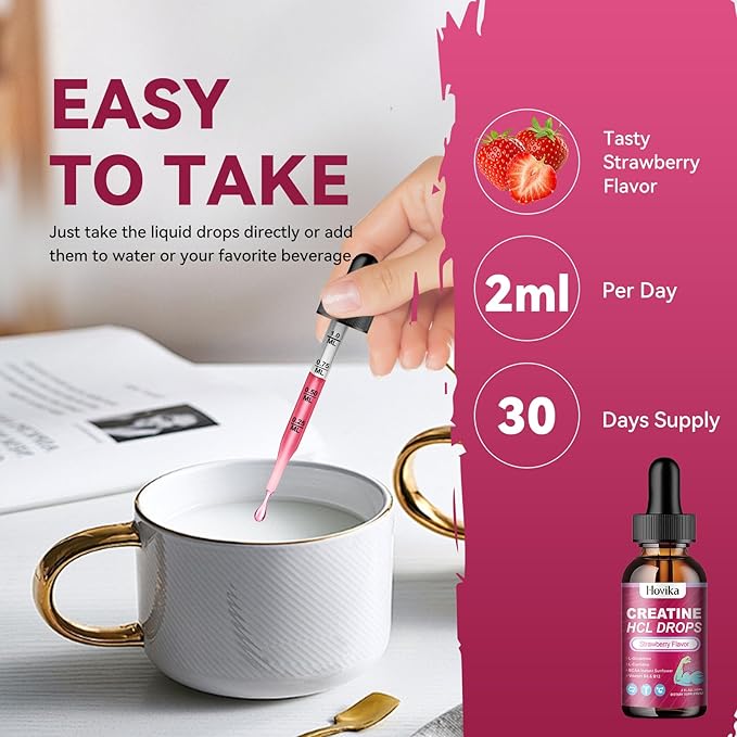 - DELICIOUS & EASY TO TAKE- The great tasting liquid creatine drops have a delicious strawberry flavor that everyone loves. It is easier to take and may have a faster and higher absorption rate comparing to gummies or pills. You may take 2 ml directly into mouth or add them in water or your favorite beverage. The creatine drops are soy free, non-GMO, gluten-free and vegan-friendly.*